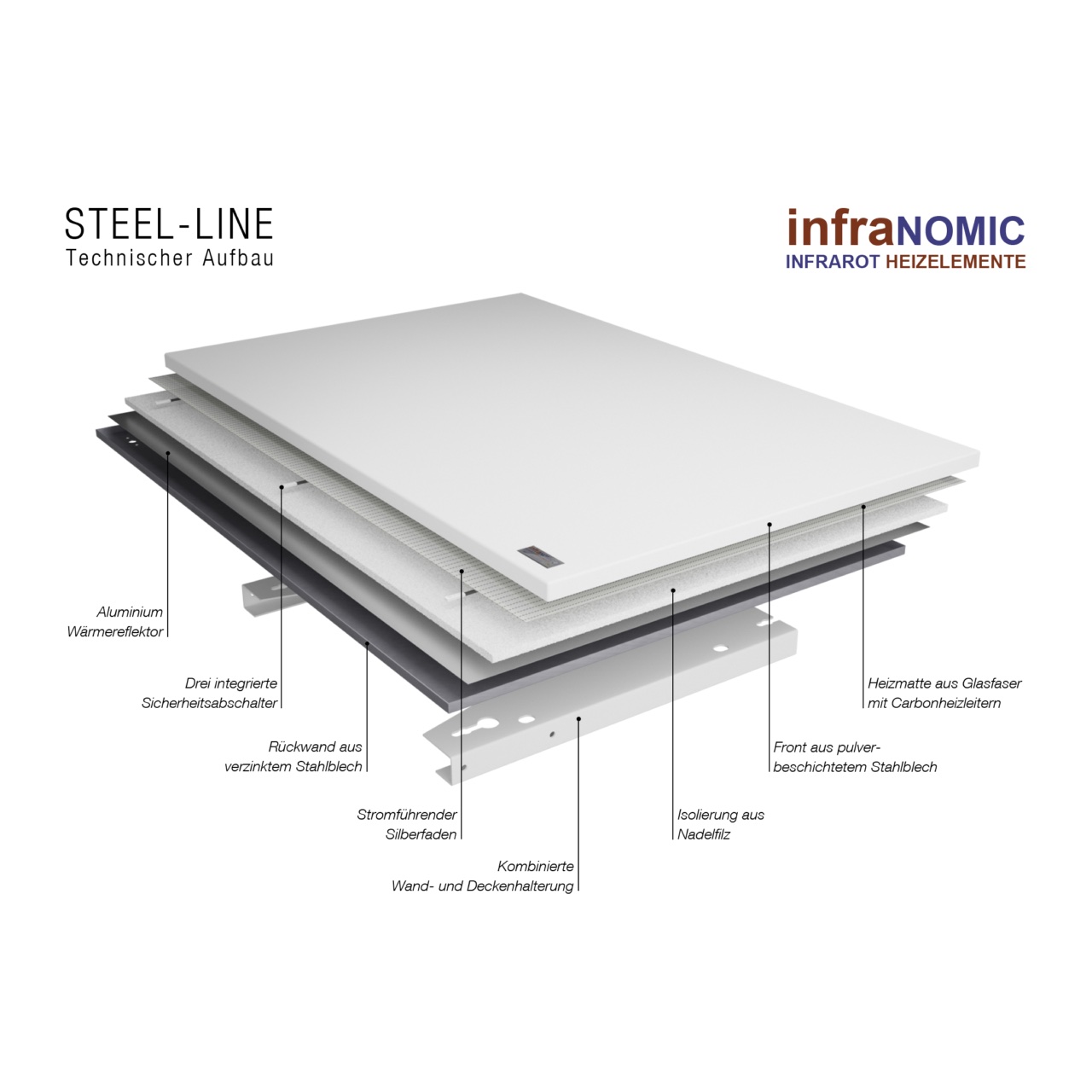 Die Heizelemente unserer Produktlinie STEEL-LINE sind 22 mm dick und bestehen aus 0,75 mm starkem Stahlblech.Mit ihrer pulverbeschichteten Oberfläche in weißer matter Feinstrukturoptik (RAL 9016) passen sich die Geräte in allen Größen harmonisch in ihre Umgebung ein.